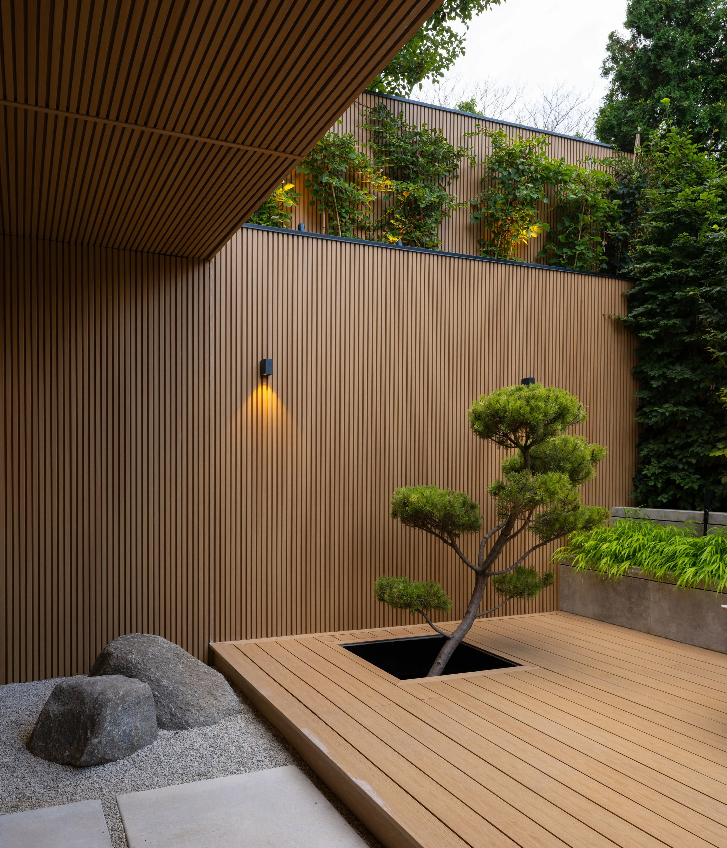 Fluted Panel Wood Screen and Outdoor Fire Place