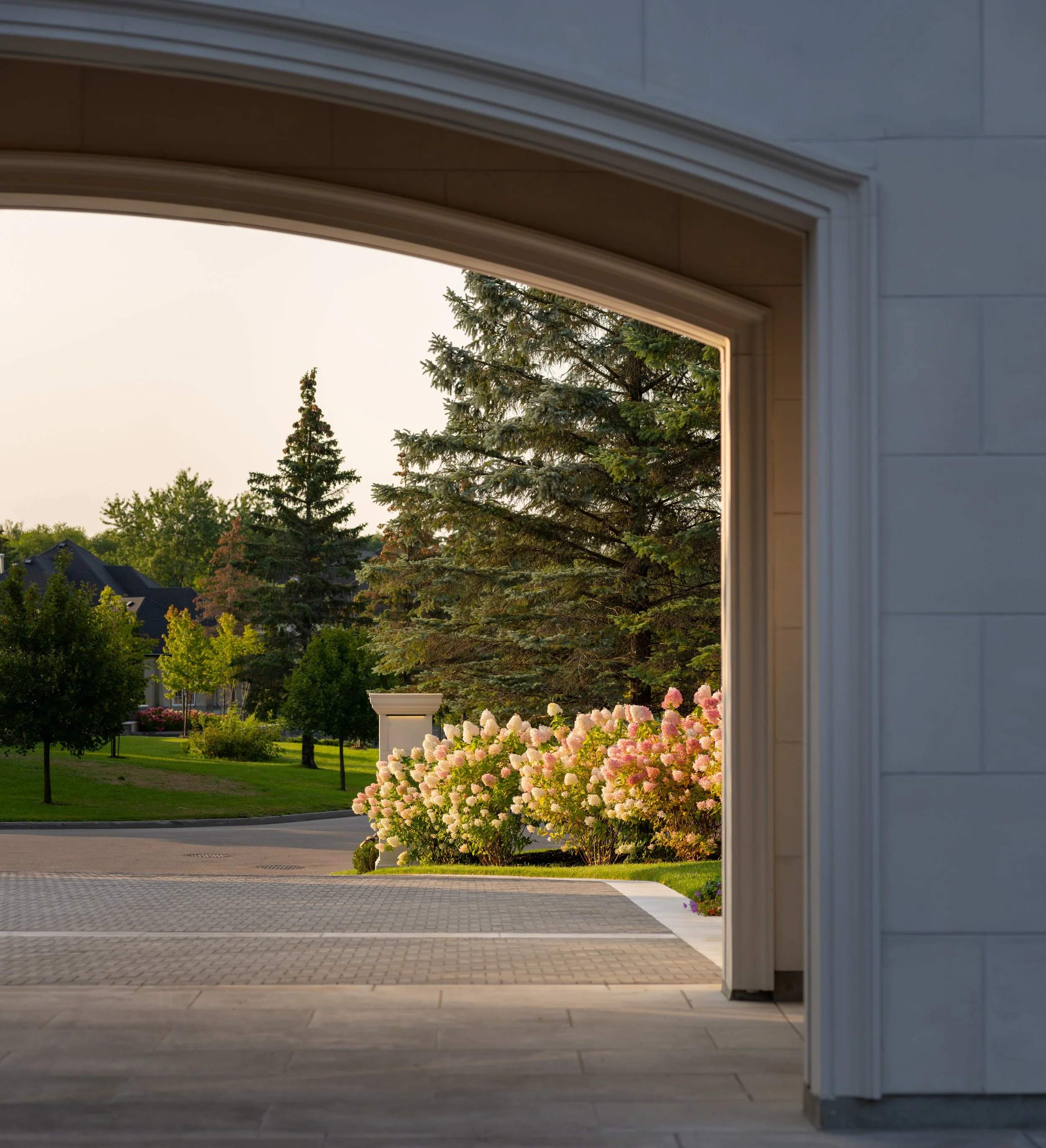 Porte Cochere framing Blushing Hydrangea’s